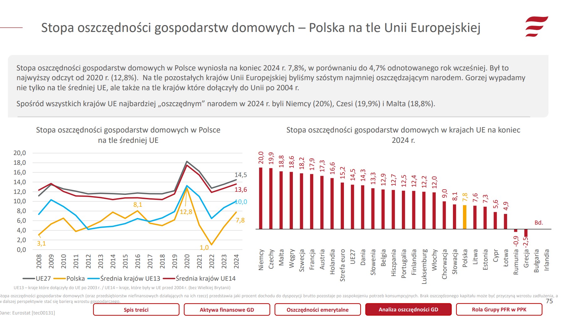 Zacznijmy od twardych liczb. Stopa oszczędności gospodarstw domowych w Polsce (czyli to, ile procent z naszych dochodów zostaje nam "na później") wyniosła na koniec 2024 roku 7,8%.